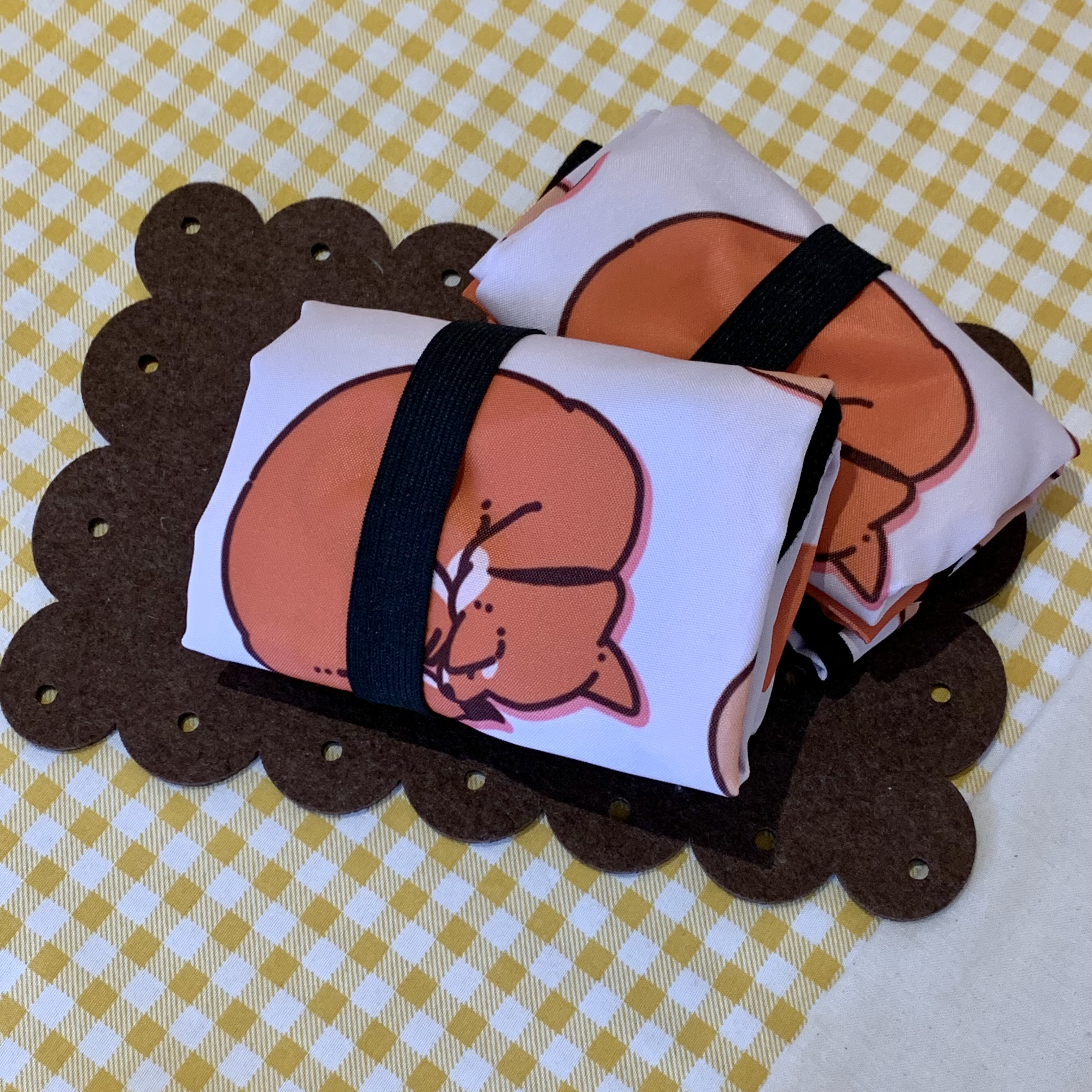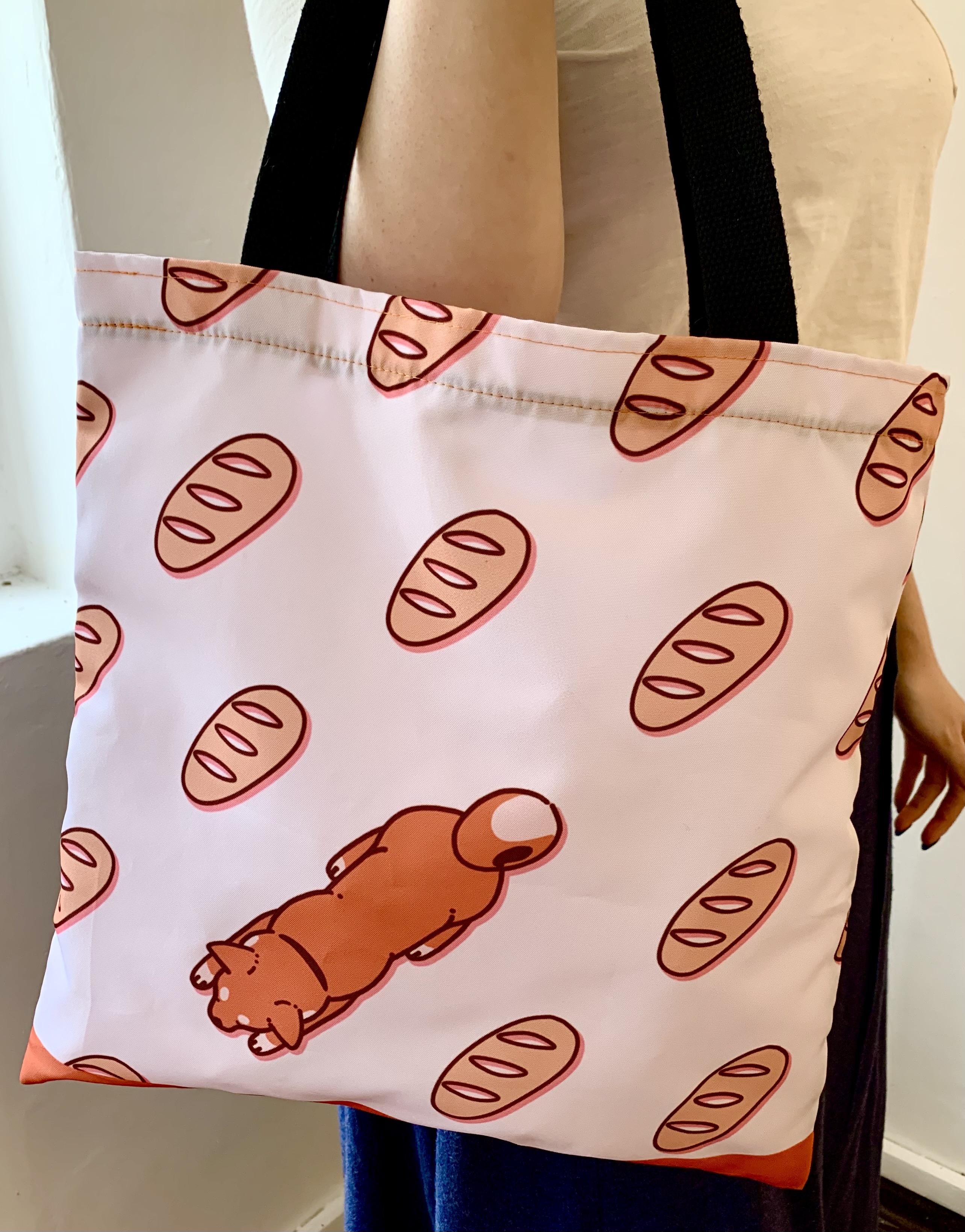 A re-usable printed cloth tote shopping bag featuring Biscuit in bread-like poses. Folds up so you can conveniently bring it wherever you go.